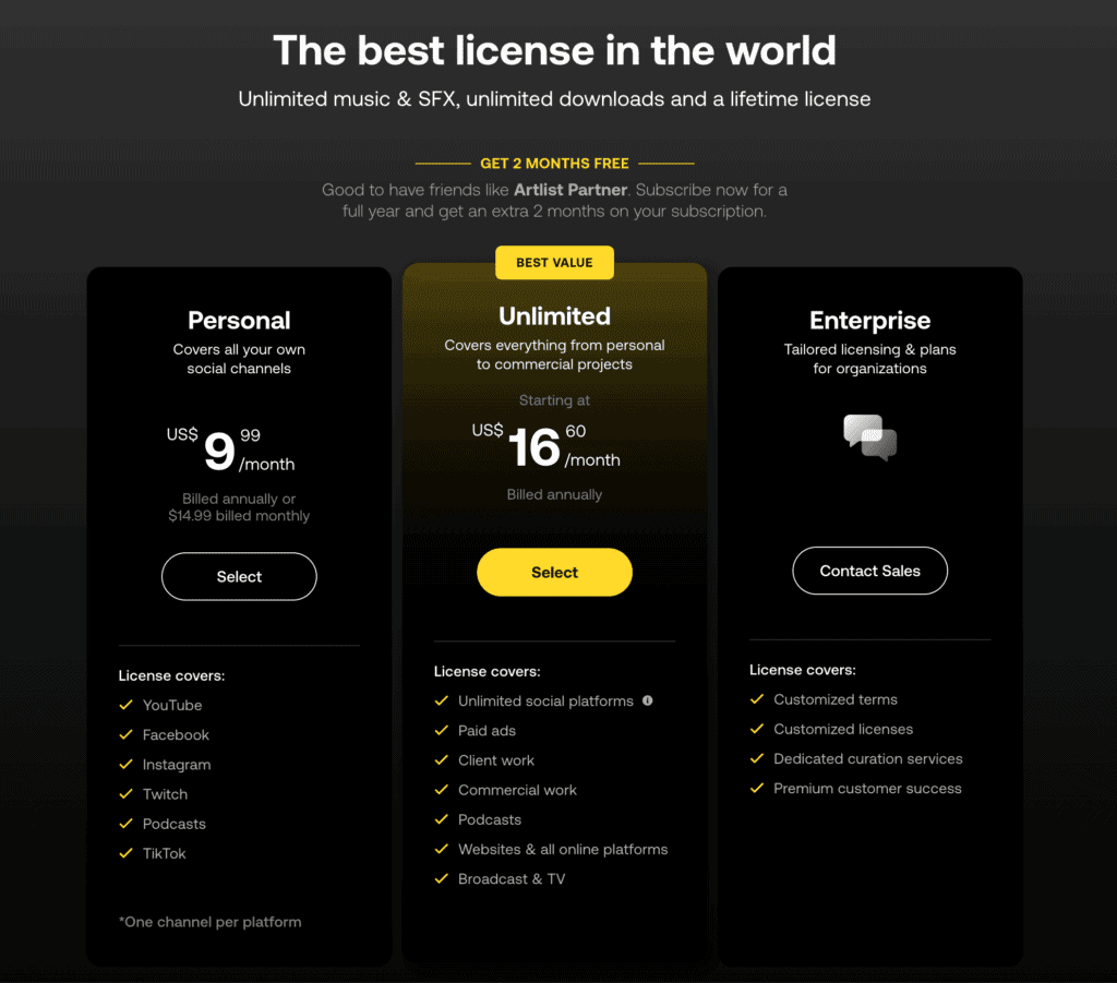 Katakanlah Anda ingin menggunakan lagu-lagu Artlist untuk dua saluran YouTube, saluran utama dan saluran vlogging Anda. Dalam hal ini, Anda harus meningkatkan ke paket Tidak Terbatas mereka.