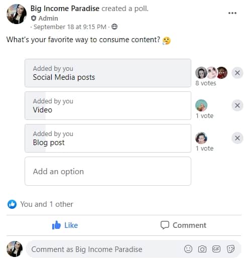 Una volta determinato il tuo obiettivo, è il momento di creare la domanda del sondaggio e le possibili scelte di risposta. Assicurati di mantenere la domanda chiara e concisa e le scelte di risposta dovrebbero essere pertinenti e interessanti per il tuo pubblico. Ecco un esempio di un sondaggio che ho creato nel mio gruppo Facebook :