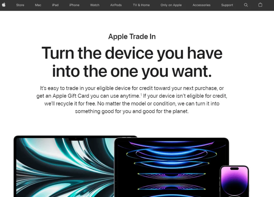 Il servizio di permuta di Apple offre credito in negozio sotto forma di valore commerciale o buoni regalo per prodotti Apple usati. Puoi vedere i prezzi online e avere la possibilità di spedire i tuoi vecchi prodotti i o semplicemente portarli al tuo negozio Apple locale per permuta o aggiornamento.