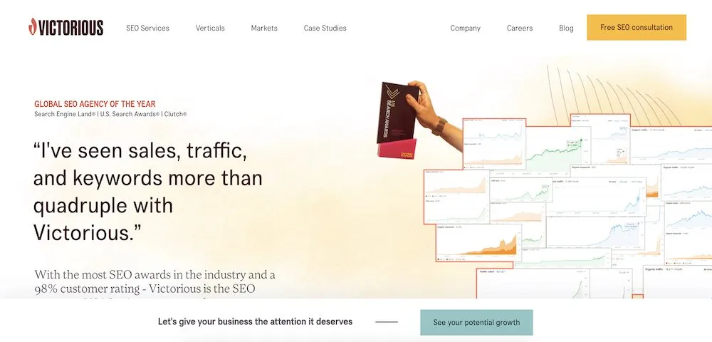 Victorious è un'agenzia SEO pluripremiata. Nel 2020, Victorious è stato vincitore del Global Search Awards per il miglior uso della ricerca - SEO. I servizi SEO di Victorious includono la creazione di contenuti SEO, audit SEO, SEO on-page e SEO off-page. Anche se sono un'agenzia SEO, non misurano il successo solo in base alle misure del traffico organico e al posizionamento delle parole chiave. Il loro obiettivo finale è migliorare il ROI (ritorno sull'investimento) del cliente. Per una consulenza gratuita con Victorious, compila semplicemente il modulo sul loro sito Web e uno dei loro esperti SEO ti contatterà.