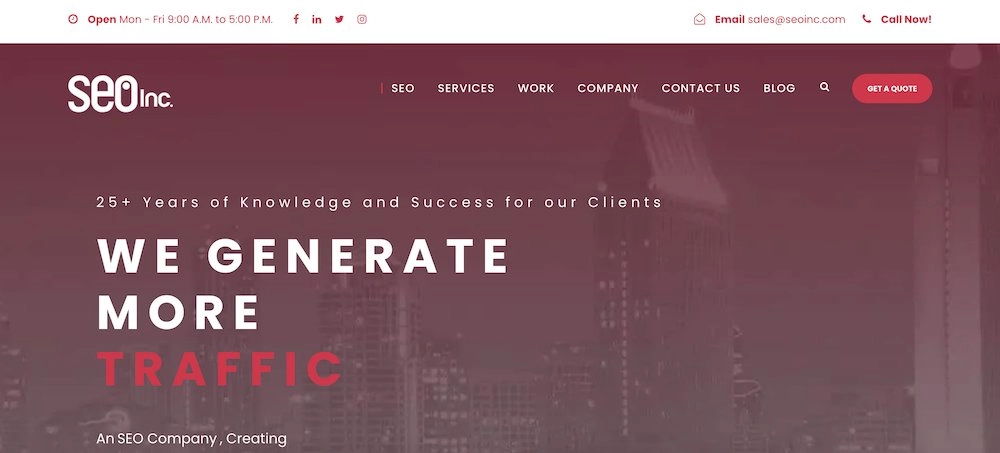 Fondata nel 1997, SEO inc è una società di marketing su Internet con 25 anni di esperienza in attività in crescita attraverso i propri servizi SEO. Quando inizi con SEO inc, il loro team di esperti condurrà un audit del tuo sito Web e un'analisi della concorrenza. Utilizzeranno quindi i risultati di questa analisi per creare una campagna per aumentare le entrate e il traffico nel modo più adatto alla tua attività. SEO inc inizialmente si concentra sul targeting delle parole chiave primarie sia nel codice del sito web che nel contenuto per aumentare il ranking, concentrandosi anche sul quadro più ampio: trasformare il traffico in vendite e lead.