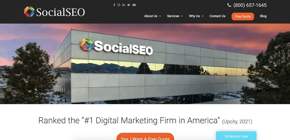 SocialSEO è una società di marketing esperta con esperienza in servizi SEO per esigenze sia B2B che B2C (business to customer). I loro servizi SEO locali, nazionali, di e-commerce e aziendali coprono una moltitudine di fattori che influenzano il posizionamento e la portata della tua attività. Questi fattori includono SEO on-page e ottimizzazione dei contenuti, SEO off-page, analisi della concorrenza, velocità del sito, ottimizzazione del tasso di conversione e presenza sui social media, a seconda delle esigenze della tua piccola impresa. Per una consulenza e un preventivo gratuiti, vai al sito Web di SocialSEO per compilare il modulo e uno dei loro rappresentanti si metterà in contatto con te.