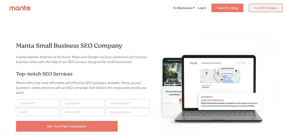 L'approccio in cinque fasi di Manta per far crescere la tua presenza online è il seguente: in primo luogo, i suoi esperti conducono un pre-audit del tuo sito web per costruire un piano per la tua attività, seguito da una ricerca di parole chiave approfondita. Quindi i rappresentanti di Manta daranno consigli per correggere le prestazioni del tuo sito Web e raggiungere i clienti. Infine, il tuo team SEO fornirà aggiornamenti mensili della campagna. Per iniziare con Manta, vai al loro sito Web per un'analisi gratuita del sito Web.