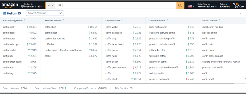 Questa nuova funzionalità prevede l'algoritmo di ricerca di Amazon e visualizza le combinazioni di parole chiave basate sulla parola chiave seed immessa dall'utente. Preparati per parole chiave a coda lunga organizzate in base al volume di ricerca, metriche per le parole chiave correlate di Amazon e accedi ai grafici di tendenza del volume di ricerca storico!
