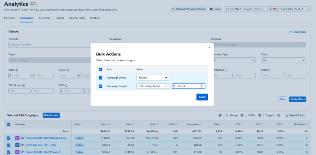 Con la nuova funzione di caricamento collettivo, i venditori potranno selezionare qualsiasi quantità di entità, scegliere tra una varietà di modifiche, applicare modifiche e visualizzare/esportare le modifiche tramite una nuova scheda in Adtomic. Nota, questa funzione è attualmente disponibile in accesso anticipato per i membri Helium 10 Elite e sarà sbloccata per i membri Diamond a Sell + Scale il prossimo mese.