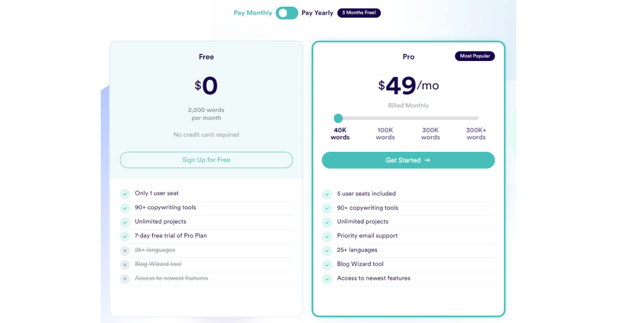 Al contrario, Copy.ai offre 1 piano tariffario a pagamento: