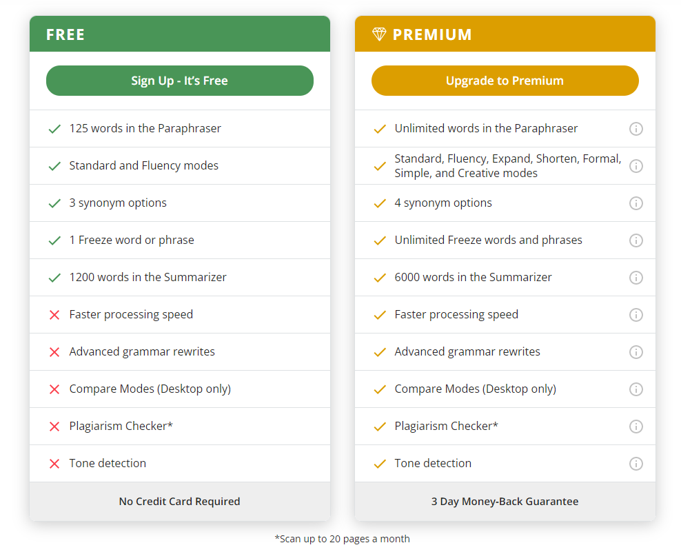 Quillbot offre per sempre gratis e un piano tariffario a pagamento.
