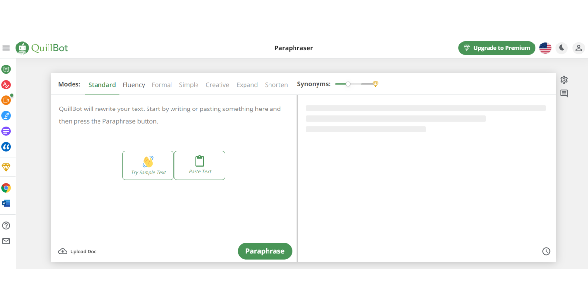 - Interfaccia utente semplice – QuillBot non richiede competenze o competenze tecniche preliminari da utilizzare grazie alla sua interfaccia utente semplice, chiara e ordinata.