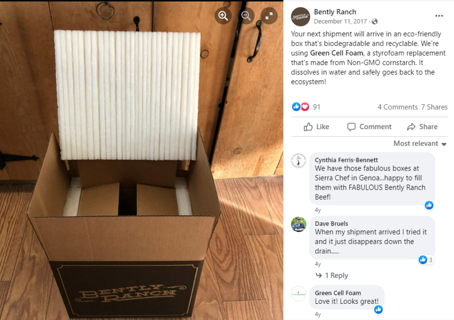 Molte aziende hanno abbracciato la schiuma a cellule verdi come alternativa sostenibile ai prodotti a base di petrolio, tra cui Bently Ranch, un produttore di prodotti a base di manzo nutrito con erba.