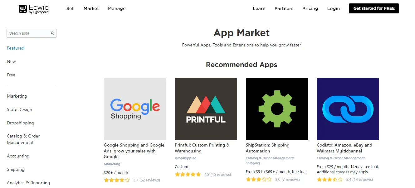 Il mercato delle app di Ecwid offre una varietà di applicazioni web . Puoi trovare integrazioni redditizie con fornitori di servizi popolari come Printful, Wholesale2B, Spocket e Syncee.