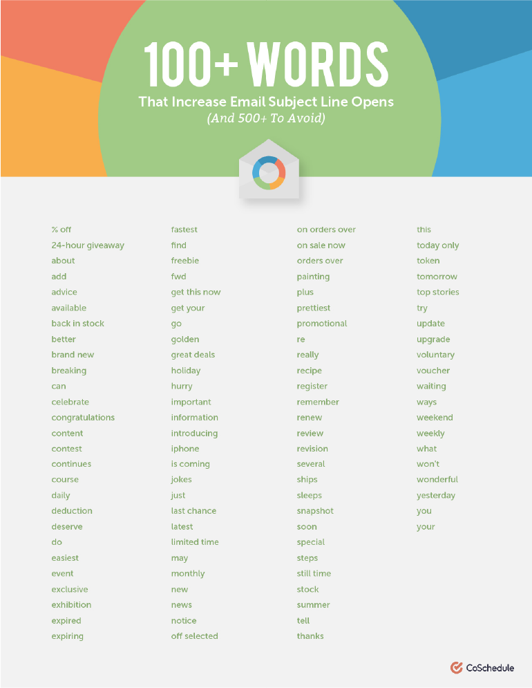 - Usa un linguaggio evocativo: Inoltre, ti consigliamo di utilizzare un linguaggio che coinvolga il lettore e susciti il suo interesse. Il linguaggio emotivamente carico ed evocativo ha un effetto migliore rispetto alle descrizioni piatte. Questo elenco di parole per le righe dell'oggetto di CoSchedule può aiutare: