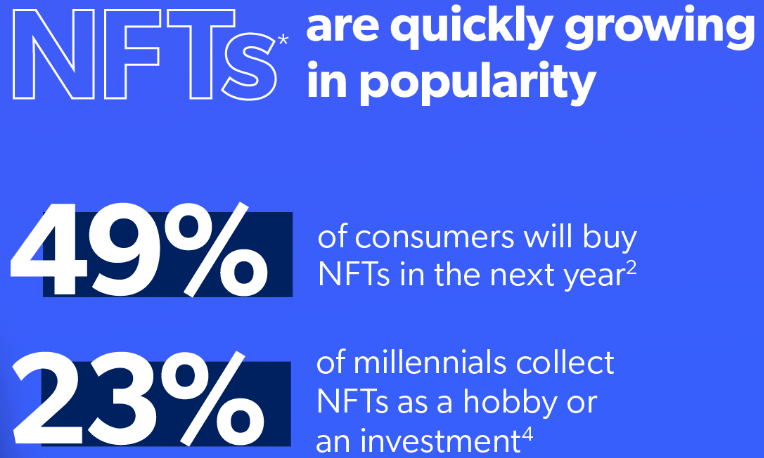 Anche gli acquirenti prestano attenzione agli NFT. Il nostro sondaggio ha rilevato che il 59% dei consumatori sa cos'è un NFT e il 22% sa cos'è. Certamente non le risposte più rassicuranti. Ma quasi la metà degli acquirenti prevede di acquistare un NFT nel prossimo anno e il 27% prevede di acquistarne uno ad un certo punto. Quindi vale la pena prestare attenzione.