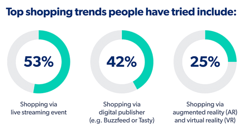 E quando torniamo a questo sondaggio, vediamo che questi sono chiaramente argomenti ancora caldi. Lo shopping in live streaming, ad esempio, è qualcosa di cui gli acquirenti sono particolarmente entusiasti. Si prevede che le vendite di acquisti dal vivo rappresenteranno circa il 20% di tutto l'e-commerce entro il 2026, secondo McKinsey.