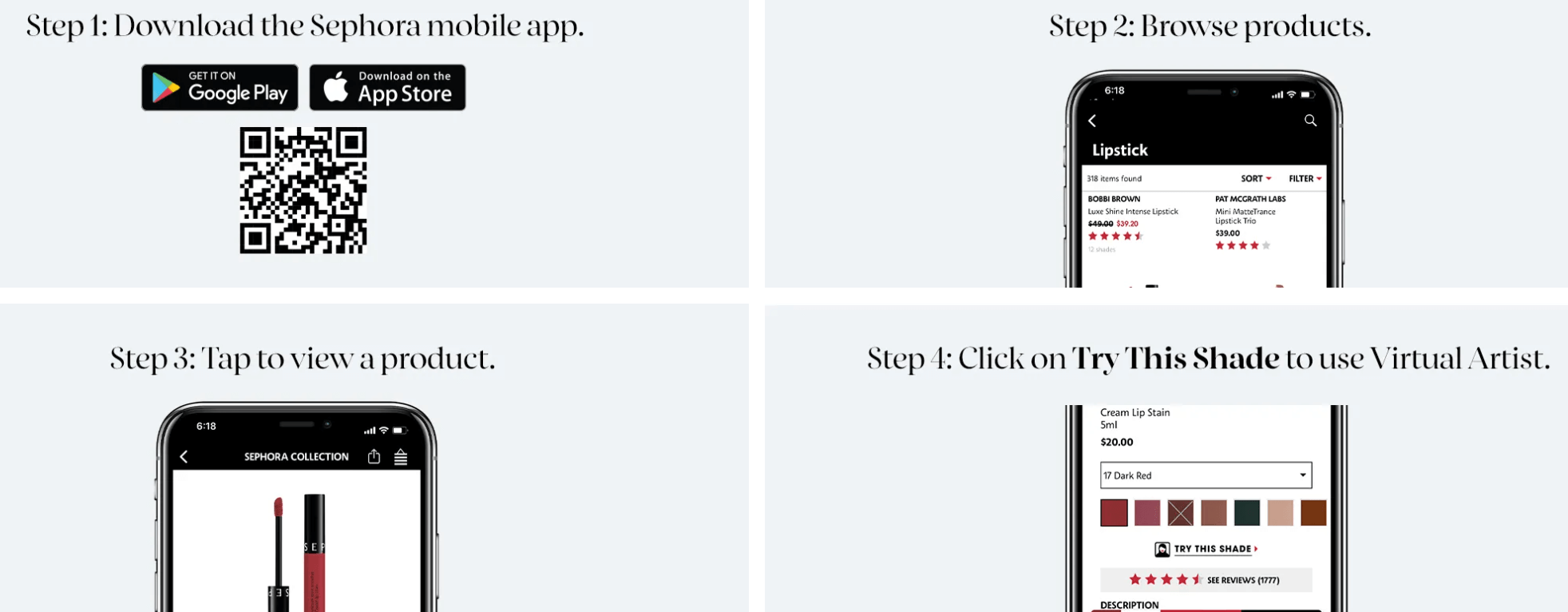 Sephora è un marchio che ha già avuto successo con l'AR grazie al suo strumento Virtual Artist che consente agli acquirenti di trovare la tonalità di ombretto perfetta. L'app mobile utilizza l'AR e il riconoscimento facciale per consentire agli acquirenti di confrontare i prodotti e provarli prima dell'acquisto.