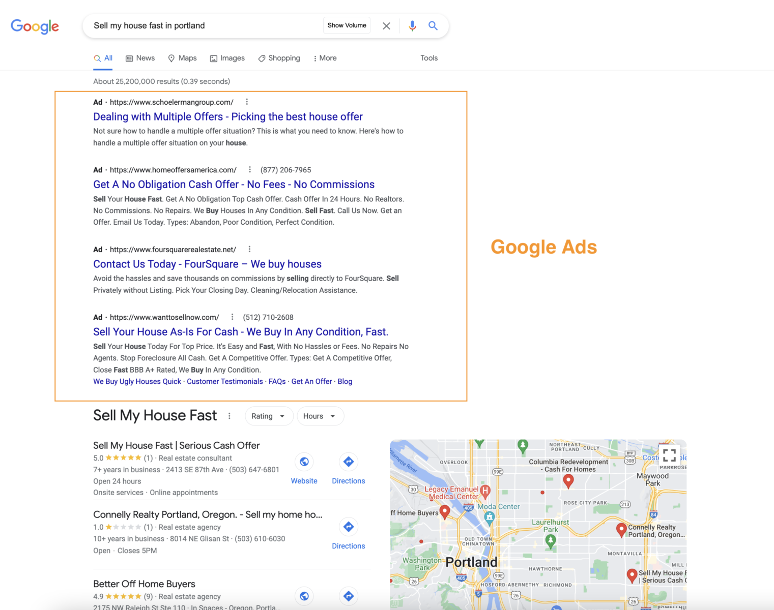 Google Ads è un'altra potente piattaforma pubblicitaria per gli investitori immobiliari. Una delle parti migliori della pubblicità di Google è che non è lo stesso tipo di marketing di interruzione degli annunci di Facebook: a causa della natura della piattaforma, le persone stanno effettivamente cercando qualsiasi cosa il tuo annuncio stia promuovendo... purché il targeting per parole chiave sia laser- focalizzata.