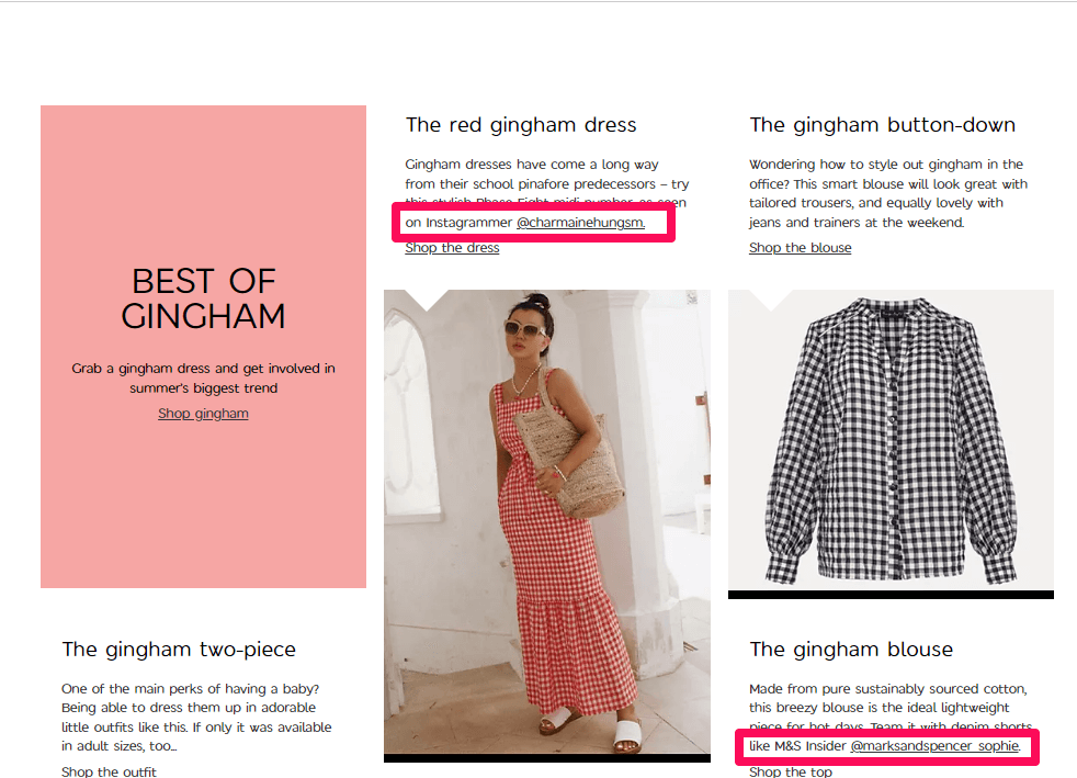 Il marchio Marks and Spencer ha anche creato una forte presenza su Instagram pubblicando stili di tendenza sul suo sito Web principale, quindi taggando gli influencer che originariamente hanno disegnato e pubblicato l'immagine.