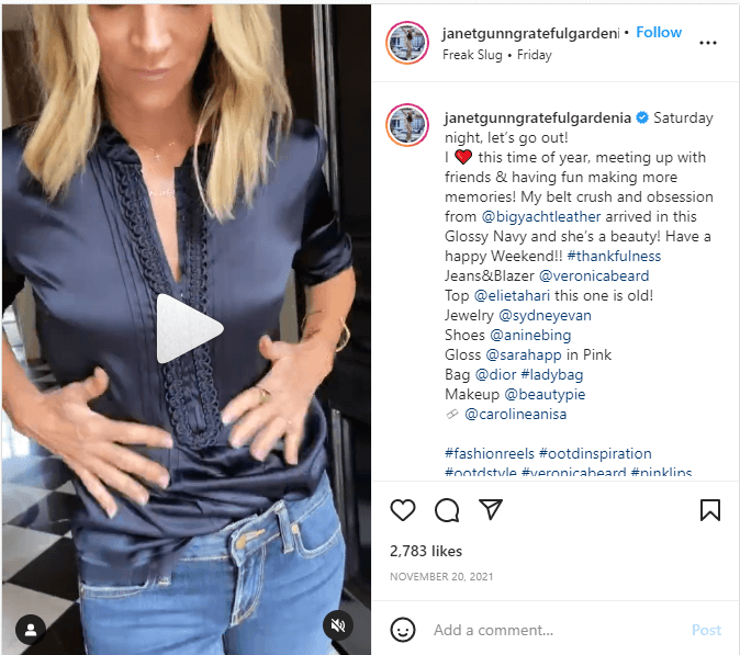 I marchi meno conosciuti possono ottenere una grande visibilità da influencer che abbinano pezzi di più marchi, come questo post di @janetgunngratefulgardenia.
