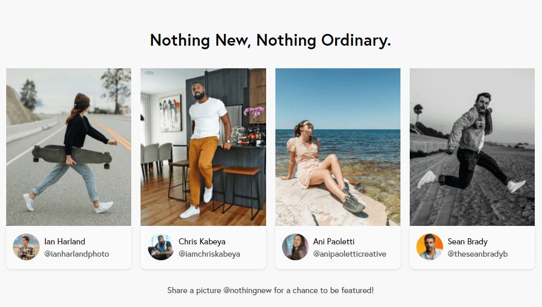 Probabilmente non esiste una piattaforma migliore per il marketing degli influencer della moda di IG. Se presenti influencer sulla tua home page, collega la loro immagine alla pagina del tuo prodotto dove gli acquirenti possono acquistare ciò che indossava l'influencer, come fa Nothing New.