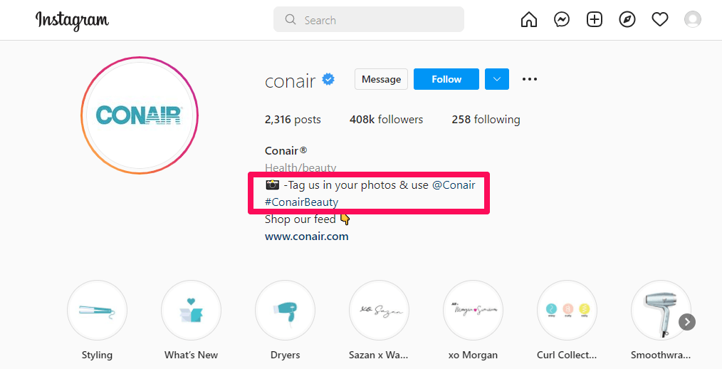 Dovresti incoraggiare gli utenti di tutti i giorni a promuovere il coinvolgimento del marchio attraverso i contenuti generati dagli utenti (UGC). Quando i tuoi fan vogliono trovarti o condividere i loro UGC, rendilo molto semplice pubblicando i tuoi hashtag con il tuo marchio nella tua biografia, come fa Conair.