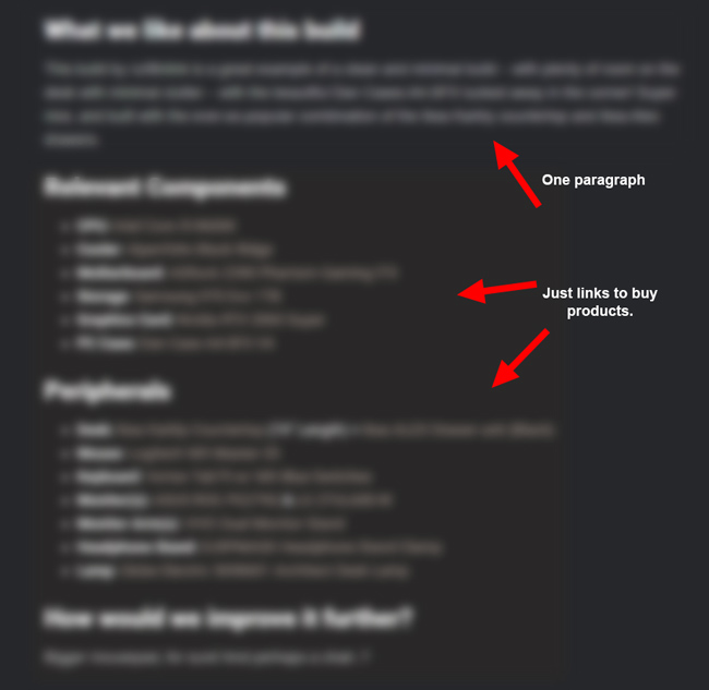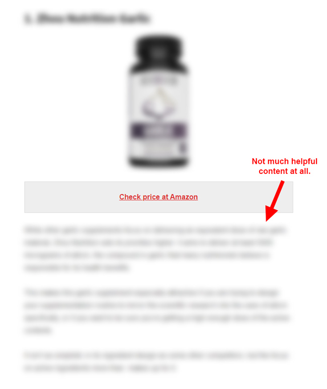 Quando si controllano i contenuti che sono caduti, molti di questi non sono stati incredibilmente estesi. Certo, potrebbe fornire un paragrafo o due sul prodotto, ma spesso non mi dava i dettagli che volevo per prendere una decisione di acquisto. E d'altra parte ( per lo più ), molte delle recensioni che sono aumentate (o sono rimaste con classifiche forti) erano più dettagliate, fornivano più equilibrio, contenevano chiare informazioni sugli affiliati, immagini forti e sono state scritte da esperti o appassionati in quelle categorie.