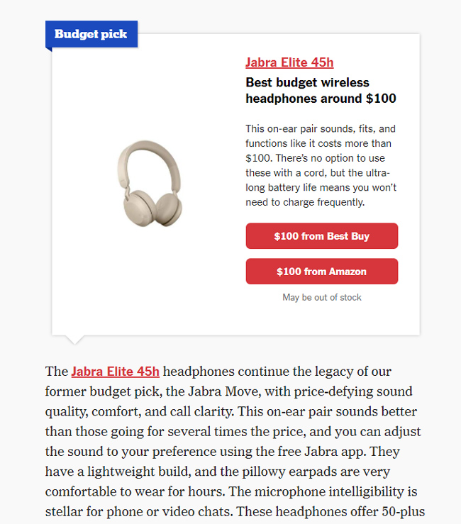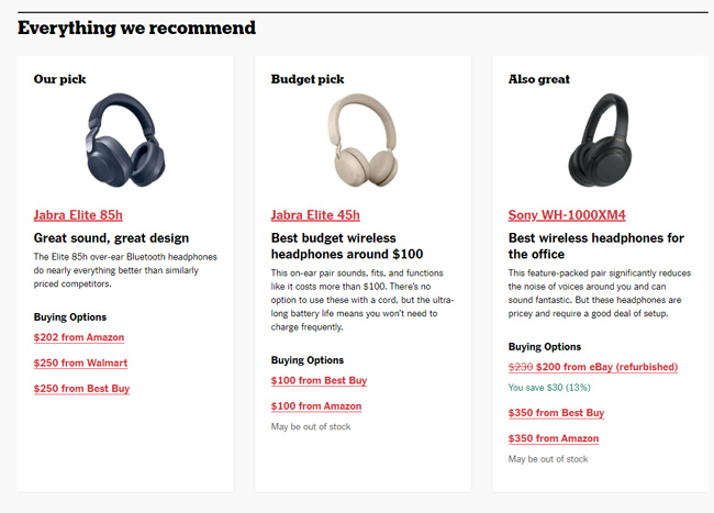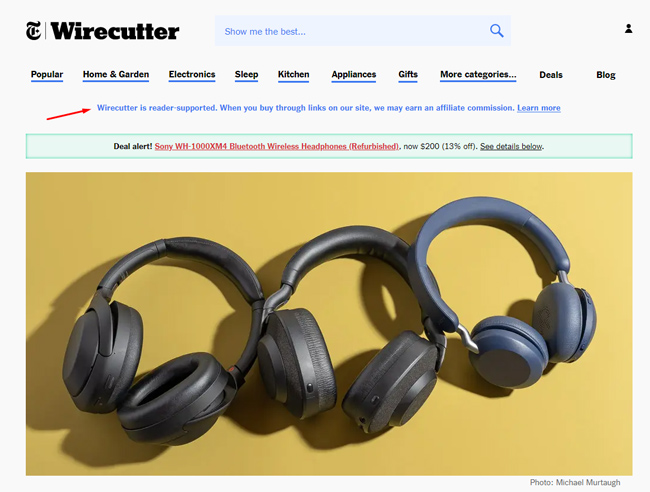 Wirecutter fornisce un'ottima struttura per le loro recensioni, ricca di informazioni approfondite, uniche e preziose per i consumatori, presentate in modo intuitivo, con chiare informative sugli affiliati, informazioni sull'autore e altro ancora. Ancora una volta, se ti concentri sulle recensioni, ci passerei un po' di tempo.