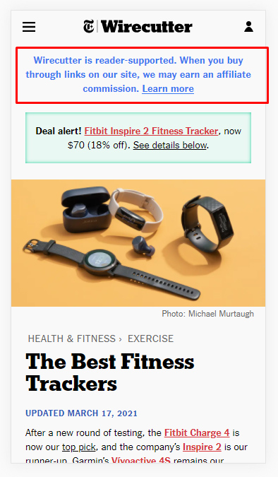 E per me, oltre a "chiaro", dovrebbe trovarsi in aree della pagina in cui gli utenti possono effettivamente trovarlo. Ad esempio, durante la mia analisi (di questo aggiornamento e degli ampi aggiornamenti di base), ci sono volte in cui le informazioni sugli affiliati sono sepolte nella pagina. Potrebbero trovarsi in fondo e in un carattere più piccolo, potrebbero essere nella barra laterale e talvolta non sono nemmeno sulla pagina. Invece, potrebbe esserci un piccolo link per leggere la "Informativa sull'affiliazione" in un'altra pagina.