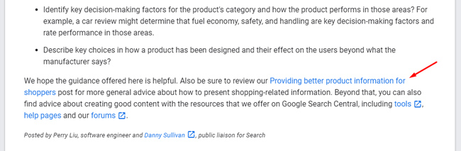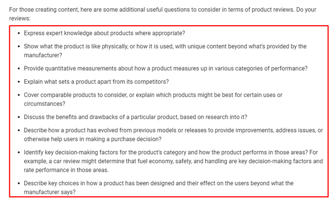 - Esamina l'elenco delle domande nel post del blog di Google sull'aggiornamento delle recensioni dei prodotti e nel relativo post sugli aggiornamenti di base. Esamina obiettivamente queste domande e determina le lacune nel tuo approccio e rivedi i contenuti.