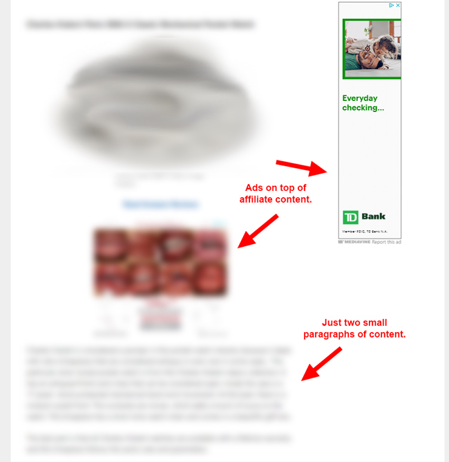 Se hai letto uno qualsiasi dei miei post sugli aggiornamenti di base dell'algoritmo, allora sai che annunci aggressivi, dirompenti o ingannevoli possono essere seriamente problematici per un sito. Una cosa che ho notato durante l'analisi di molti siti con recensioni è stata la tessitura di molti annunci all'interno dei contenuti di affiliazione. L'ho trovato estremamente fastidioso e quei siti stanno subendo un doppio calo dal punto di vista della monetizzazione. Stanno guadagnando entrate pubblicitarie mentre guadagnano anche commissioni di affiliazione quando le persone fanno clic e acquistano qualcosa. Per essere chiari, quei siti possono assolutamente farlo, ma l'impatto sull'esperienza dell'utente può essere estremo in alcuni casi.