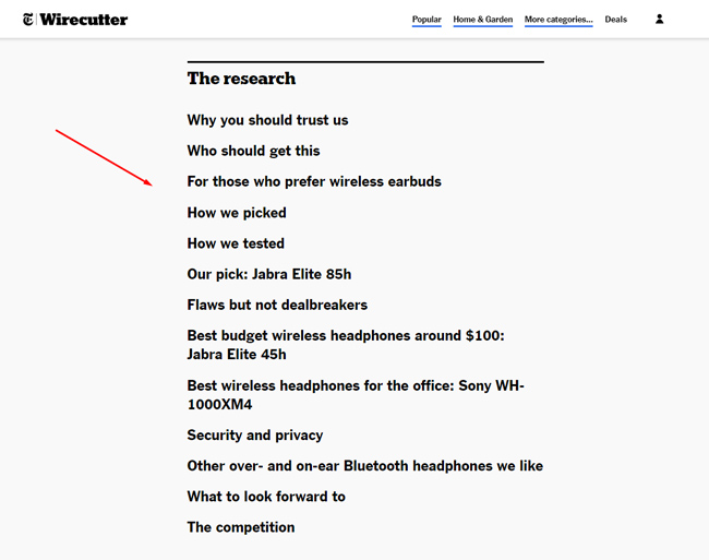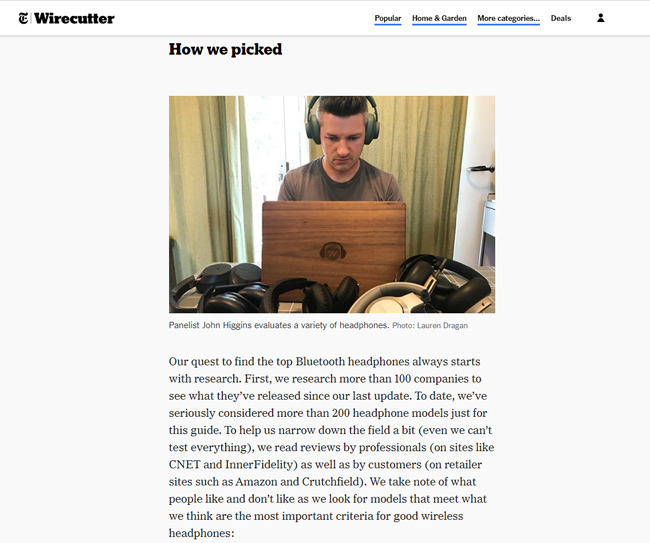 So che molti di voi leggendo questo post vogliono vedere alcuni buoni esempi di recensioni. Ancora una volta, la mia intenzione non è quella di richiamare determinati siti per recensioni negative o di concentrare l'attenzione su molti siti che sono aumentati. Detto questo, esiste un sito che produce alcuni dei migliori contenuti di recensioni sul web: Wirecutter. Fornirò un esempio di seguito evidenziando alcune delle grandi cose che fanno con le loro recensioni. Capisco perfettamente che non è possibile per molti siti eguagliare o superare ciò che Wirecutter sta facendo, ma sarebbe intelligente rivedere i loro contenuti per ottenere una comprensione più ampia di come creare contenuti di recensioni eccezionali. È anche importante capire che ogni verticale è diverso e richiederà diversi livelli di competenza, ricerca e completezza.