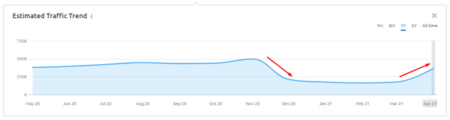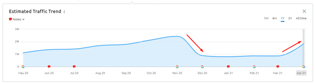 L'8 aprile 2021 Google ha annunciato un nuovo aggiornamento dell'algoritmo chiamato Product Reviews Update. L'aggiornamento è stato progettato per premiare recensioni approfondite rispetto a contenuti più sottili (indipendentemente dal fatto che si tratti di una singola recensione di prodotto, di un gruppo di prodotti, di recensioni di servizi, ecc.). Ho analizzato in modo approfondito l'aggiornamento da quando è stato lanciato, incluso l'impatto su diverse nicchie categorie, contenuto interessato, risultati a livello di sito, fattori dell'esperienza utente nei siti interessati e altro ancora. Sulla base di ciò che ho visto, l'aggiornamento è stato simile all'aggiornamento di base per alcuni siti. Ad esempio, alcuni siti interessati stanno subendo forti cali o picchi in base all'aggiornamento delle recensioni dei prodotti.