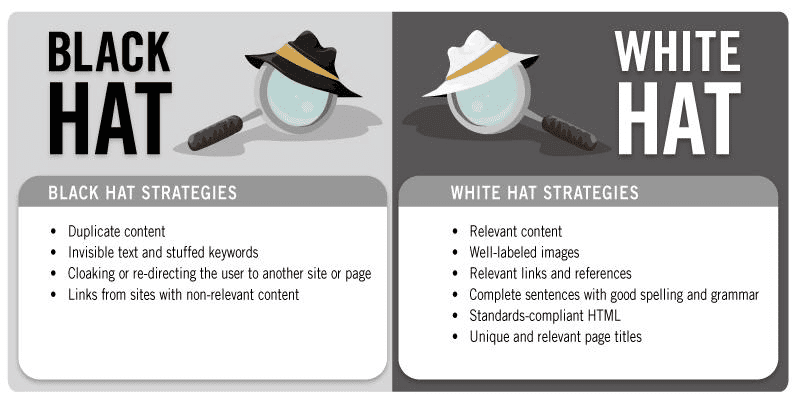 "White-hat" è il termine di Google per SEO che è al di sopra del bordo. È corretto, conforme alle linee guida di Google e condotto in modo da avvantaggiare gli utenti. Pratiche come il riempimento di link e parole chiave o l'utilizzo di software per la creazione di link automatizzati sono esempi da "cappello nero" e potrebbero comportare sanzioni.