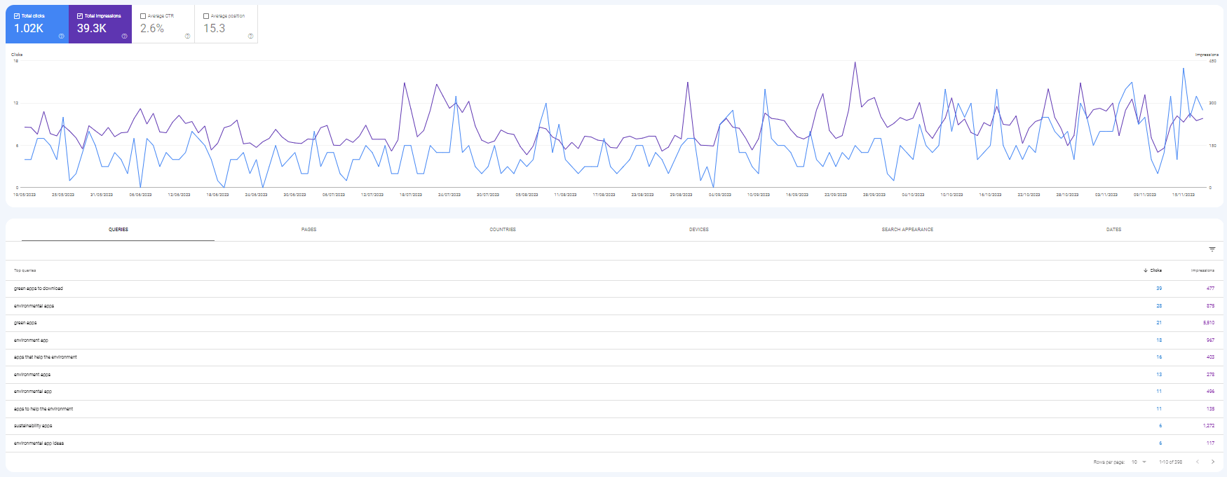 Come puoi vedere nei dati seguenti, questo elenco ha ricevuto quasi 40.000 impressioni solo su Google negli ultimi 6 mesi e si posiziona per diverse parole chiave, inclusi termini di ricerca molto competitivi come "app verdi" e "app ambientali" che aiutano a presentare i marchi elencato per persone che potrebbero non averlo mai incontrato.
