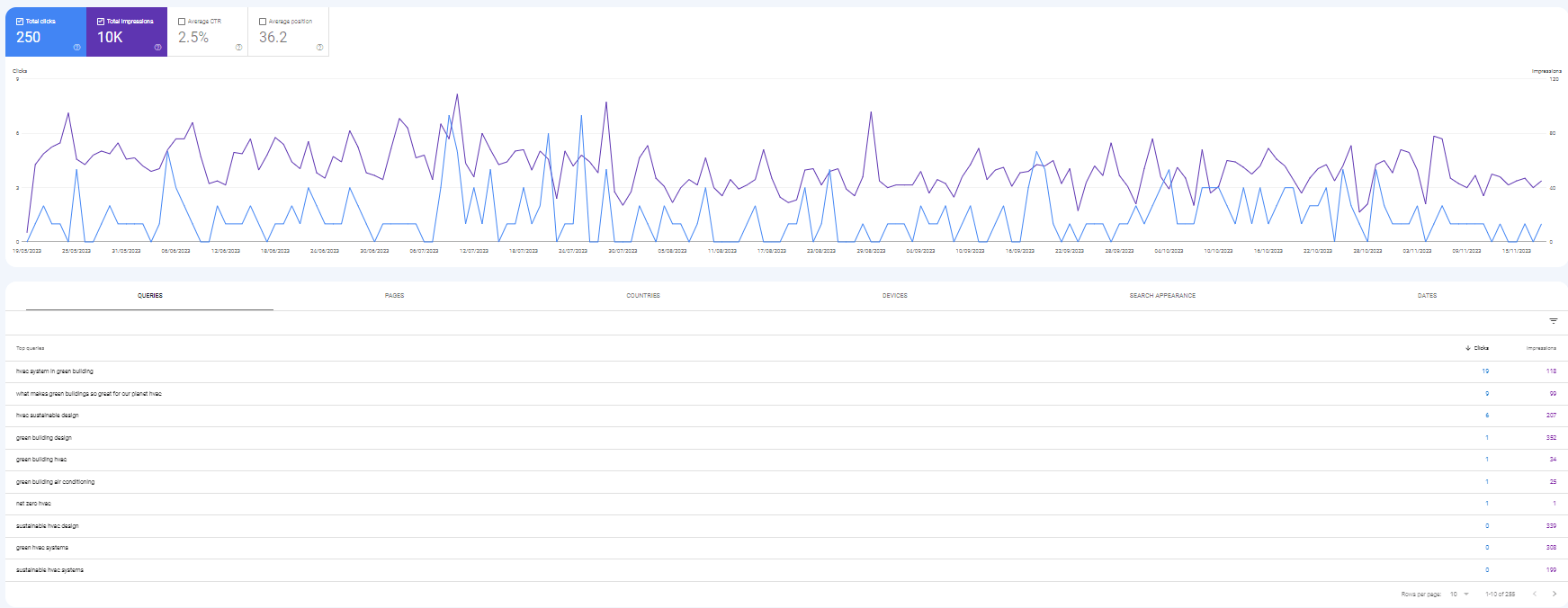Come puoi vedere nelle statistiche qui sotto, questa guida esperta si posiziona su Google per parole chiave come "sistema HVAC in bioedilizia" o "progettazione di bioedilizia", il che la porta a farsi notare da lettori che cercano informazioni molto di nicchia e specifiche, raggiungendo un pubblico informato che ha maggiori probabilità di interagire con le risorse aggiunte.