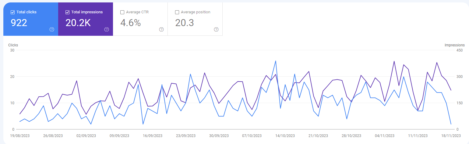 Questo articolo specifico ha funzionato molto bene come guest post (anche i loro articoli editoriali hanno un buon rendimento). Come puoi vedere, ha raggiunto un notevole livello di coinvolgimento in soli 3 mesi con quasi 1.000 clic e quasi 20.000 impressioni solo da Google, escludendo ad esempio il coinvolgimento aggiuntivo da parte di Bing, Yahoo e i clic diretti.