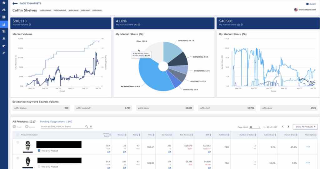 L'Helium 10 Market Tracker verifica la tua "quota di voce". Questo è il posto giusto per avere un'idea del volume generale del mercato, della tua quota di vendite e di tutti gli altri principali attori del tuo mercato. Quando nuovi giocatori/venditori entrano nel mercato con un'idea di prodotto come la tua, li vedrai apparire e potrai scegliere di seguirli, aggiungendoli alla dashboard del tuo market tracker.