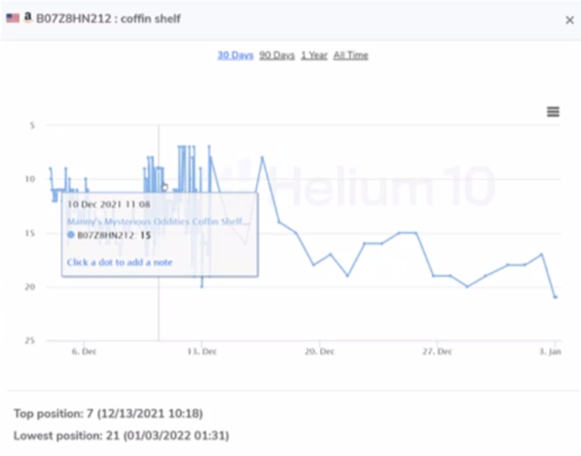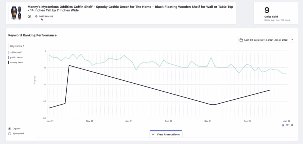 Il Rank Tracker di Jungle Scout si comporta in modo simile al Keyword Tracker di Helium 10, offrendo ai venditori una rapida occhiata ai preziosi dati sul ranking delle parole chiave. La differenza con Rank Tracker è che tutto viene visualizzato in un unico grafico. Sebbene ciò riduca effettivamente tonnellate di informazioni complesse in un grafico conveniente, può diventare disordinato se gli utenti cercano costantemente di ricercare diverse parole chiave sullo stesso grafico.