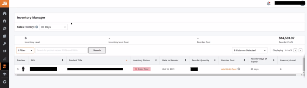 Il Gestore dell'inventario di Jungle Scout consente agli utenti di visualizzare la cronologia delle vendite degli ultimi 15, 30, 60, 90 o 120 giorni. Lo stato del livello di inventario, la data di riordino, la quantità e il costo possono essere raccolti dalla stessa dashboard.