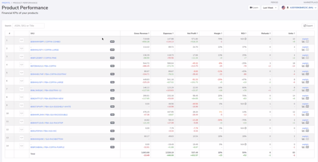 Helium 10 Profits include un'ampia panoramica finanziaria con la possibilità di accedere a tutti i tuoi prodotti redditizi nello stesso posto. Ciò include le vendite di prodotti giorno per giorno per ogni prodotto che gli utenti hanno collegato ai propri account. Profitti mostra anche tutti i rimborsi dei prodotti, i motivi di tali rimborsi e la possibilità aggiuntiva di visualizzare tutti gli eventi finanziari (come i rendiconti profitti e perdite).