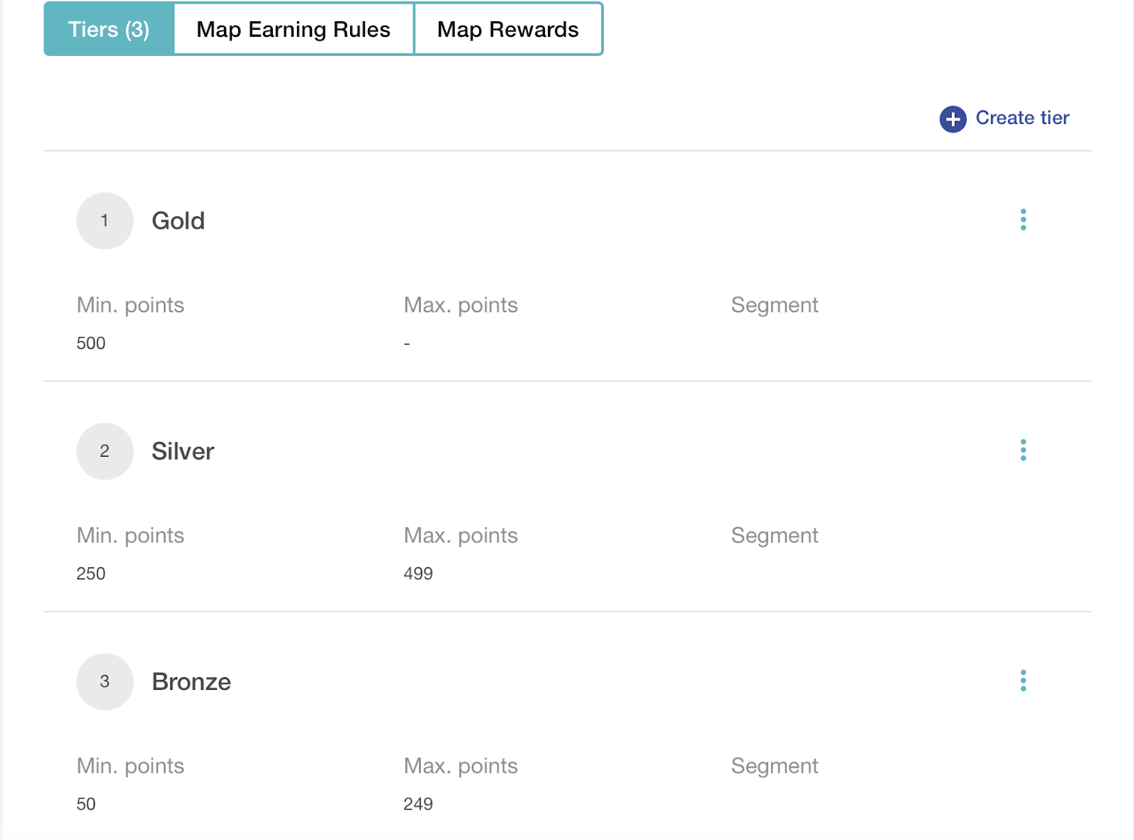 Determina quanti livelli avranno i membri del tuo programma fedeltà e quali azioni (regole di guadagno) dovranno intraprendere i clienti per salire di livello. Ad esempio, potresti avere un livello Bronze, Silver e Gold, con membri di livello superiore e clienti di livello superiore, che devono spendere una certa somma di denaro o effettuare un certo numero di acquisti per salire di livello.