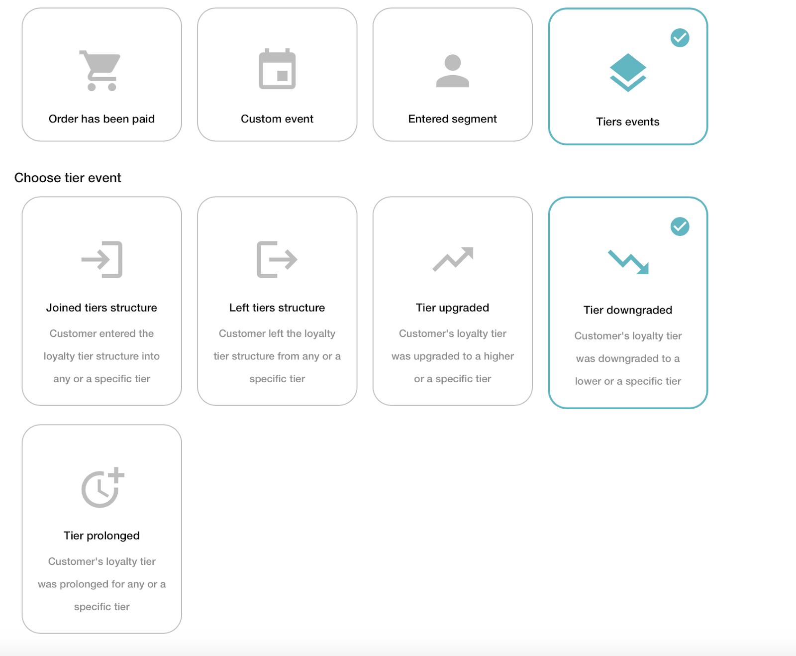 - Eventi personalizzati eseguiti dai clienti sulla tua applicazione/sito web – consente di premiare i clienti con incentivi o vantaggi basati su azioni specifiche che eseguono sul tuo sito Web o applicazione.