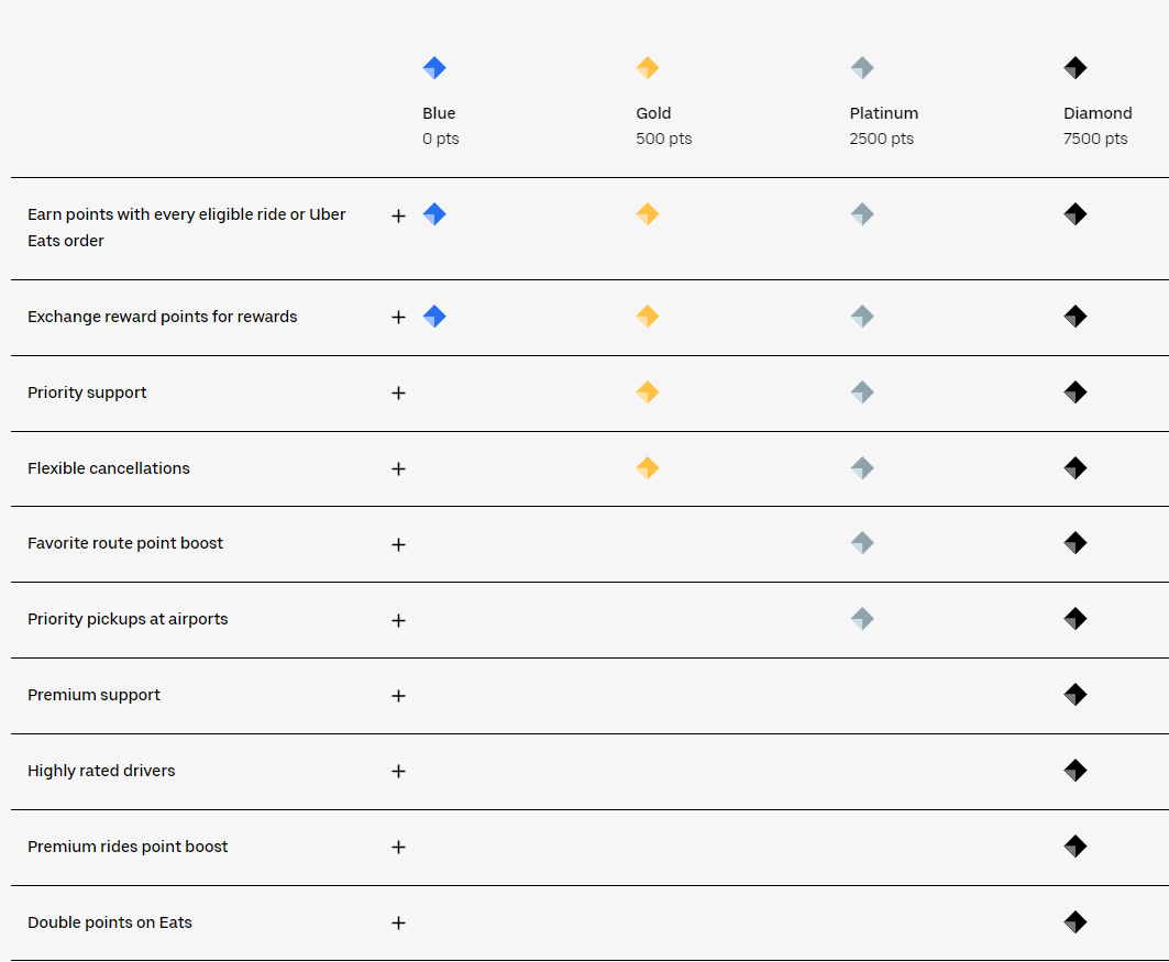 Uber Rewards è un programma fedeltà a più livelli che premia i clienti Uber per la loro fedeltà e l'utilizzo del servizio. Il programma ha quattro livelli: Blue, Gold, Platinum e Diamond. Ogni livello offre vari vantaggi come supporto prioritario, protezione dei prezzi su un percorso e accesso a funzionalità premium come Uber Black e Uber Eats. I clienti guadagnano punti per ogni dollaro speso in corse Uber, Uber Eats e biciclette e scooter JUMP. Più punti guadagnati, più alto è il livello e maggiori sono i benefici ricevuti. Il programma è progettato per incentivare l'utilizzo ripetuto della piattaforma e fornire una migliore esperienza del cliente per gli utenti fedeli.