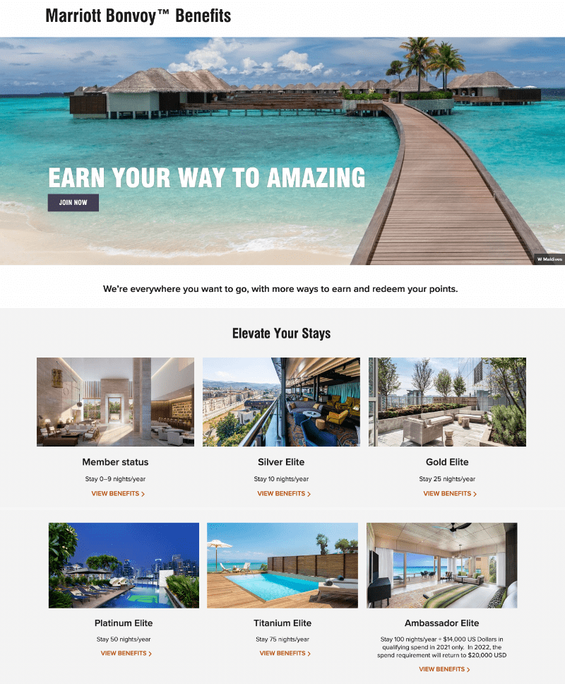 Marriott International, una delle più grandi catene alberghiere del mondo, ha un programma fedeltà a più livelli chiamato Marriott Bonvoy . Il programma ha sei diversi livelli: Member, Silver Elite, Gold Elite, Platinum Elite, Titanium Elite e Ambassador Elite. I clienti possono guadagnare punti soggiornando negli hotel Marriott, prenotando attraverso il loro sito Web e utilizzando le carte di credito co-branded di Marriott. Questi punti possono essere riscattati per soggiorni in hotel gratuiti, voli, noleggio auto e altre spese relative ai viaggi. Inoltre, man mano che i clienti avanzano di livello, sbloccano vantaggi esclusivi come check-out posticipato, colazione gratuita e servizi di pianificazione del viaggio personalizzati dal team di esperti di viaggio di Marriott.