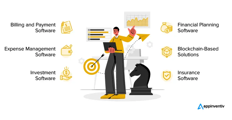 Il software finanziario si rivolge a una pletora di servizi finanziari dalla gestione degli investimenti, alla gestione delle buste paga, alla fatturazione, alle transazioni di denaro e altro ancora. Alcune delle soluzioni aziendali sviluppate negli anni sono: