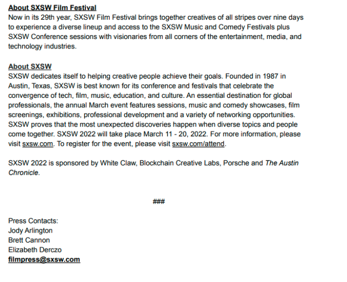 Ora che abbiamo esaminato il processo passo passo su come scrivere un comunicato stampa, esaminiamo un esempio di comunicato stampa per un evento. L'esempio di comunicato stampa di seguito viene dalla conferenza ampiamente popolare per professionisti della tecnologia, del cinema e della musica, South by Southwest. Esaminiamo il titolo, il sottotitolo e il primo paragrafo.