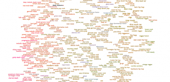 La tassonomia si presenta abbastanza frequentemente nel content marketing, ma in genere viene utilizzata per creare una sorta di flusso di lavoro. Qui lo useremo per supportare la strategia dei contenuti supportata dai dati. Prima di tutto, dovremmo capire che la tassonomia è un metodo di classificazione, ma viene utilizzata quando ci sono centinaia di elementi o idee da raggruppare e classificare per creare ordine dal caos. Glenn McDonald, il tassonomista di Spotify, ha creato Everynoise.com come esempio strabiliante. Mostra la relazione tra ogni genere musicale utilizzando colori e gruppi di parole.