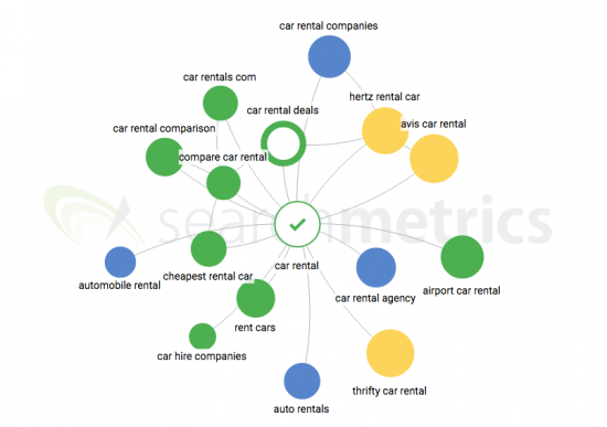 Chi ha solo una piccola padronanza della SEO sa che i motori di ricerca allegano il contesto ai termini inseriti in una ricerca. Questo è ciò a cui dovresti pensare quando strutturi la tua modellazione di argomenti semantici. Un metodo comune di modellazione degli argomenti è l'allocazione di Dirichlet latente (LDA). LDA legge una pagina come un gruppo di argomenti. Allo stesso tempo , legge ogni argomento come un insieme di parole correlate e lo analizza. È simile a quello che utilizza Searchmetrics Content Experience per la funzione Esplora argomenti. In parole povere, Topic Explorer esegue LDA al contrario prendendo la query di ricerca filtrata primaria e identificando le query di ricerca correlate e presenta una visualizzazione di come gli argomenti principali si sovrappongono agli argomenti secondari.