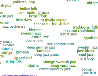 Puoi vedere dal verde bosco chiaro di "klezmer" e dalla sua vicinanza al "suono di Nashville" che ha in parte lo stesso stile di "jig and reel" e quando fai clic su ciascuno di questi, puoi sentire le somiglianze.