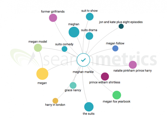 Sulla base di una ricerca statunitense, i cluster di argomenti sono legati alla futura altezza reale, messi in secchi organizzati da bolle colorate. Più grande è la bolla, maggiore è il volume di ricerca. Alcuni argomenti sono molto vagamente correlati, come "Max Beesley", che è un attore che è apparso in alcuni episodi di Suits, uno show televisivo in cui Meghan Markle interpreta un aspirante avvocato. Altri sono direttamente correlati a "Meghan Markle", come "Suits cast". Chiaramente, la maggior parte delle ricerche di Markle si basano sullo show televisivo. Per metterlo in prospettiva, ecco come appare un cluster basato sulla ricerca degli utenti nel Regno Unito: