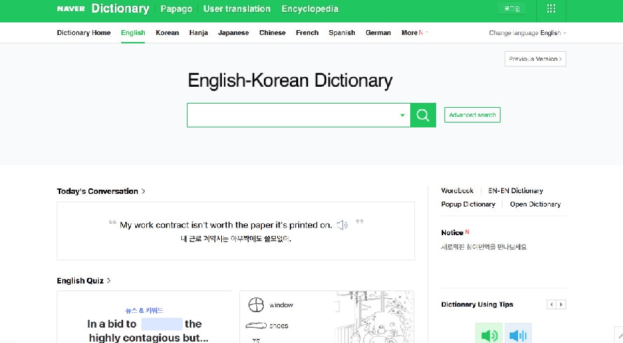 Un'altra opzione è usare il dizionario Naver. Puoi scaricare il dizionario Naver per smartphone Android e iOS. Ciò consente di tradurre sezioni delle pagine Web di Naver dal coreano all'inglese.