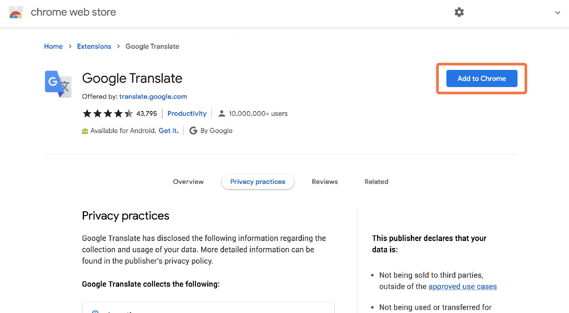Visita il Chrome Store dal tuo PC. Quindi cerca Google Traduttore. Trova Google Translate tra i risultati di ricerca e fai clic su "Aggiungi a Chrome".